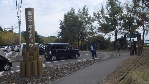 | ▼県道71号沿いに整備された千本イチョウ 県道からは開聞岳が見えます〜♪ |