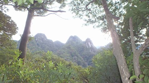 | ▼猿ヶ城渓谷へ向う途中で刀剣山(右の尖がりがT峰) まるで、ギザギザの鋸のようです! |