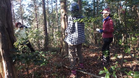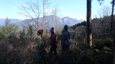 | ▼霧子山山頂から行縢山を眺望中のメンバ | ▼霧子山から望む、貝の畑山〜だき山・・・手前に茶臼山 | |