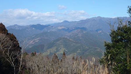 | ▼茶臼山へ続く林道、上中尾線は眺望の良いスカイライン(未舗装) | ▼林道より望む、行縢山の先に太平洋の大海原が光ります。 次に登る予定の霧子山が右方に見えます。 |