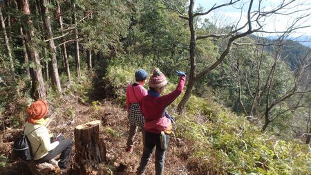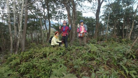 | ▼見晴らしの良い尾根で休憩中です | ▼岡富山、山頂に到着しました。 | |