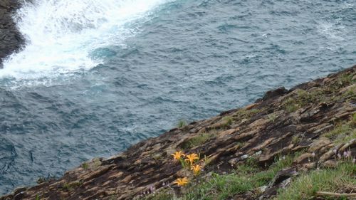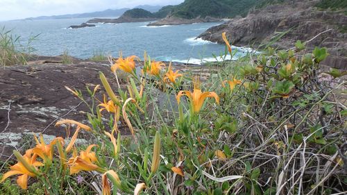 | ▼日向岬の突端まで行くと眼前に雄大な海原が広がります!♪ | ▼岩場に咲く黄色い花は、キスゲに似ていますが多分違うでしょう(汗) | |