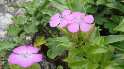 | ▼日向岬の入口に位置する『大御神社』へ参拝しましょう。 さざれ石と柱状岩が一緒に見られます。 | ▼大御神社の岩場に咲く、なでしこに似た花です。 | |