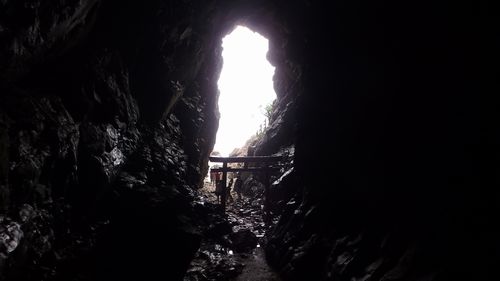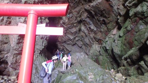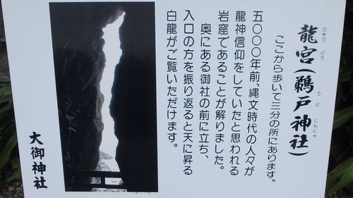 | ▼巨大な洞窟の中に『鵜戸神社』が有ります。 | ▼『鵜戸神社』から入口を眺めると、龍が上空へ昇るように見えます。 (右手前の岩と左奥の岩の間隔を狭める方向に移動すると上記案内板のようになります!) | |