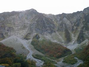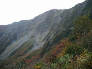| 六号目避難小屋ヵ所から望む大山北壁と紅葉 ・大山の北側稜線は切れ落ちている。 ・脆い安山岩は崩落を繰り返し以前の縦走路は通行禁止になっている。 |