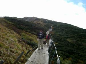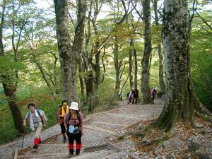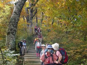 | 二合目を過ぎて少し紅葉が見られ出す。 ・登山道は良く整備されて迷うところないが階段状の登りは結構シンドイ(^_^;) |