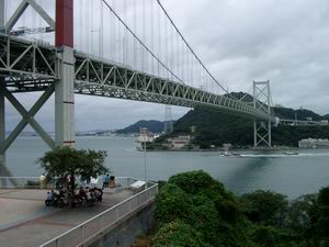 | 本州と九州をつなぐ関門橋 関門海峡は潮の流れが速く自分が動いているかのような錯覚をおこす。 |