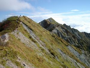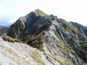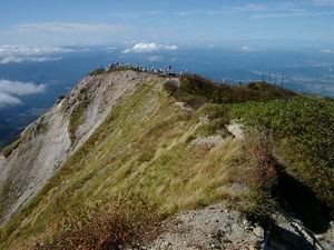 | 弥山三角点ピークから望む剣ヶ峰(大山の最高峰) ・2000年秋の地震により縦走ルート各所で崩落し剣が峰へは現在通行禁止。 ・尖り峰は登頂意欲をあおるが眺めるだけでガマン・ガマン(^_^;) |