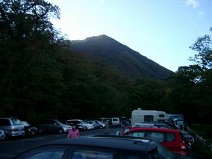 | ■平成15年10月12日(晴れ) ←駐車場から望む大山 (読み:だいせん) 大山夏道登山口近くの下山キャンプ場駐車場 (普通車¥410) ・駐車場の下がキャンプ場で前日からの野営テントが何張りか見られた。 ・今回我々も下山後ここで野営の予定だったが天候不良の予報に取りやめ岡山県の青年の家で宿泊。 翌朝風呂場の掃除や朝のつどいなど規則が厳しいが一人千円程度で宿泊できる。 |