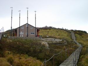 | 大山頂上小屋 ・太陽光発電パネルや風力発電設備を備えトイレや売店が有る。 ・小屋上の山頂ヵ所では大勢の登山者が休憩中 |