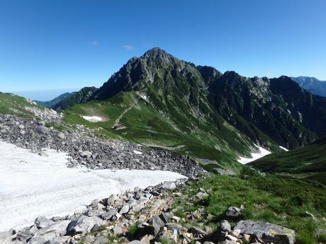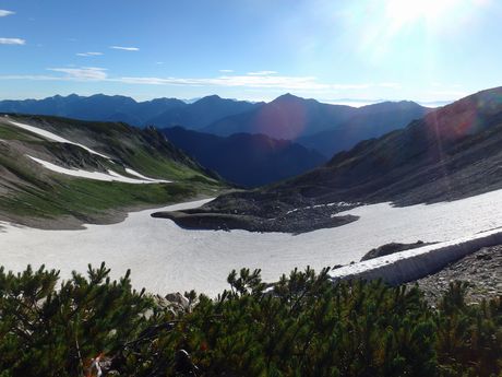| ▼雪渓越しに望む、鹿島槍ヶ岳(2889m) 左後方には白馬岳(2932m) |