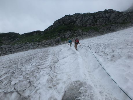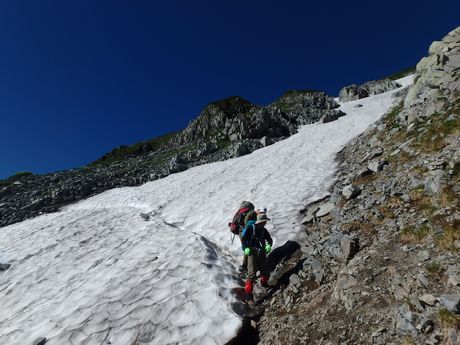 ▼8//21)室堂から雪渓を渡り今宵の宿、一ノ越山荘へ (所要時間:45分) |
