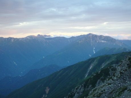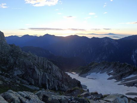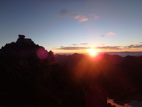 | ▼8/22)立山(雄山)に神主さんの姿が見えます(参拝料金:500円也) 鹿島槍ヶ岳の方向からのご来光を拝みます。 |
