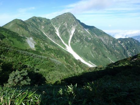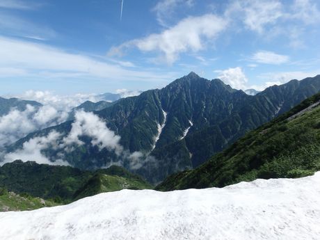 ▼大日岳方面より望む剱岳は鋭峰に見えます 足元には雪渓が残っています |