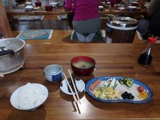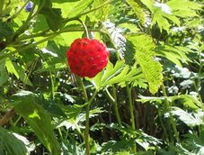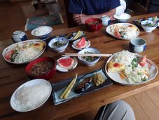 | ▼本日の山歩きで見つけた木苺、赤いトラノオ似の花? | ▼大日平山荘の夕食&朝食 アットホームな雰囲気で、お風呂に入れるのがうれしいですね |