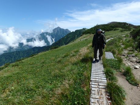 | ▼振り返り見る大日岳 木道が現れると大日平山荘は近いですよ |
