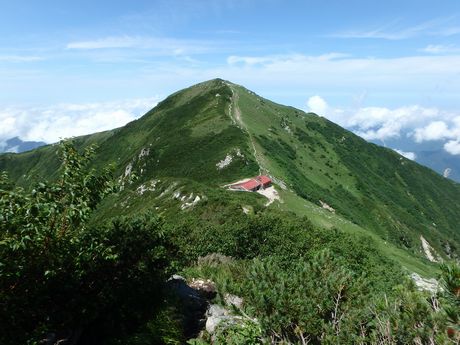 ▼中大日岳より望む、大日岳(2501m) 眼下には大日小屋の赤い屋根が見えてきました |