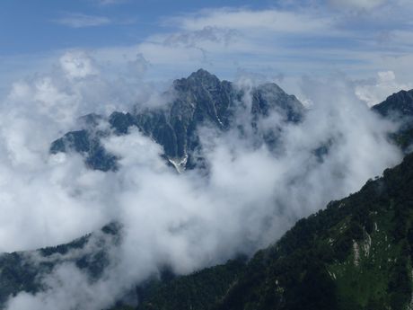 ▼大日岳より望む剱岳はガスがかかり始めました |