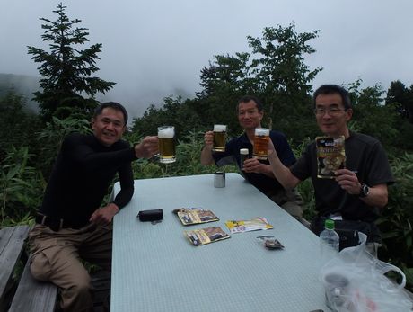 ▼お風呂から上がり、テラスに移動して乾杯〜♪ 生一杯、800円也 山小屋は標高1800m付近にあるので風呂上りでも涼しいです |