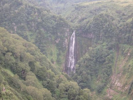 | ▼山荘の裏手から望む『不動滝』 不動滝の上部には、弥陀ヶ原の平原が広がります。 |