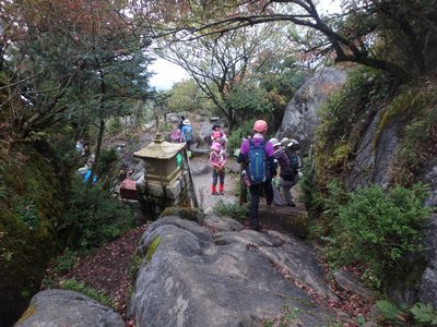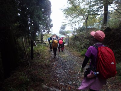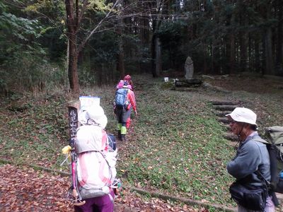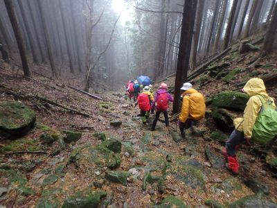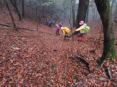 | ▼落ち葉で滑らないように用心して下ります。 | ▼人工林ヶ所になるとガレ場状になります。 | |