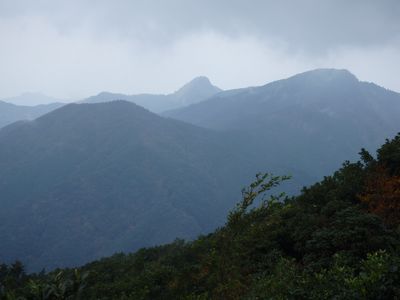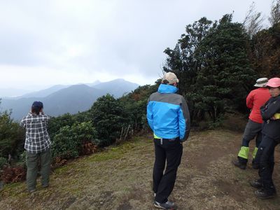 | ▼馬見山からの眺望を楽しんでいます。 | ▼馬見山から、屏山(右端)と中央奥に古処山を望む | |