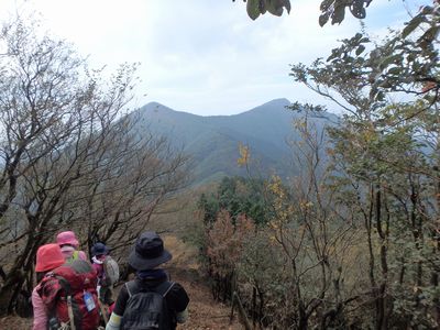 | ▼馬見山で昼食後、落ち葉を踏みしめ屏山へ向かいます | ▼屏山(右奥)が近くなりました。 (左の低いピークは標高860mの無名峰) |