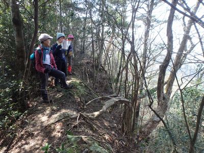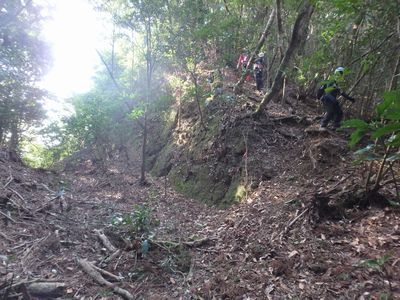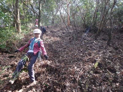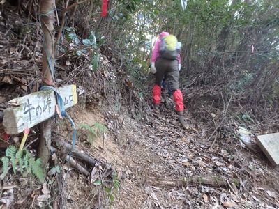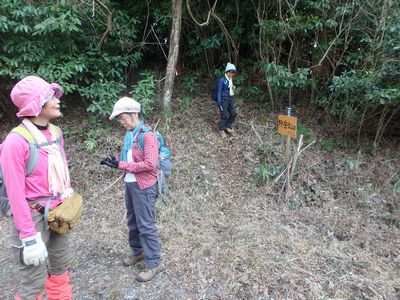 | ▼地形図記載の牛の峠へ下ります。 | ▼地形図記載の『牛の峠』です。 ここまで目印のテープが付いています。 |