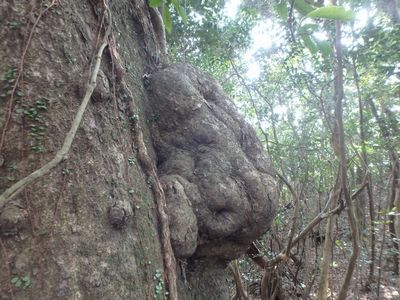 | ▼樹木に面白い容のコブを発見しました。 | ▼見方によっては、顔にもカエルにも見えます! | |
