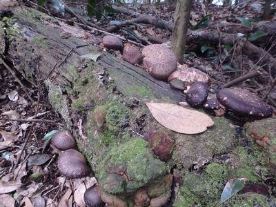 | ▼倒木にシイタケがびっしり付いています 今夜の鍋に入れましょう♪ |