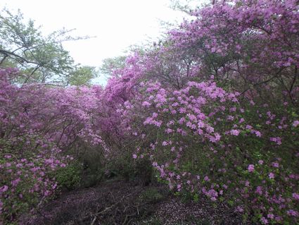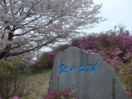 | ▼空の公園から歩いて元越山登山口へ向います 満開の桜とツツジの競演が見られました♪ |