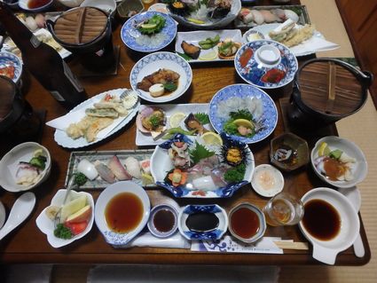 ▼夕食は、豪華な海鮮料理が並びました。 1泊2食付で、ジャスト1万円(税込) |