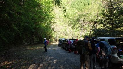 | ▼国道326号 桑の原トンネルの宮崎側にメンバー集合です。 | ▼桑の原林道の広場に駐車します。 | |