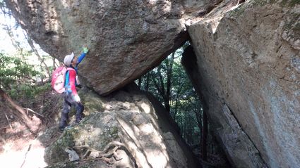 | ▼上人岩屋分岐ヶ所です | ▼県境沿いに下山すると巨石の岩屋があります。 | |