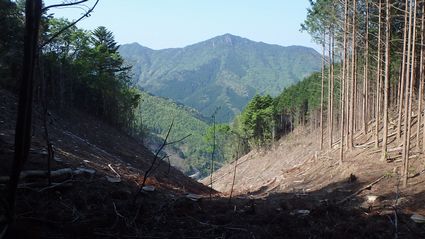| ▼県境に人工林が現れると始発の登山口が近いです。 | ▼伐採後を下ると桑の原林道へ出ます。 | |
