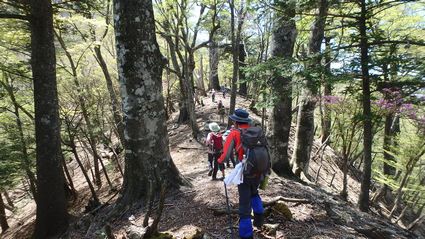 | ▼アケボノツツジ越しに傾山が見えてきました♪ | ▼ブナ林の中を歩く快適な稜線です | |