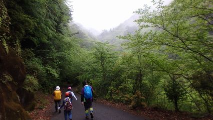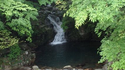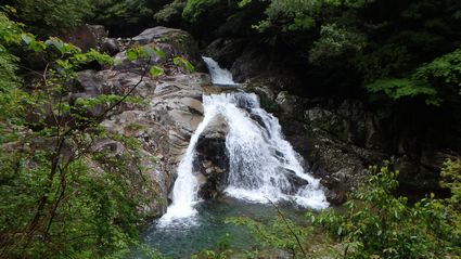 | ▼駐車場から新緑を愛でながら登山口へ向います。 | ▼尾鈴山登山口近くの滝です。 | |