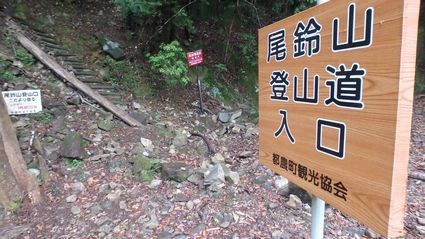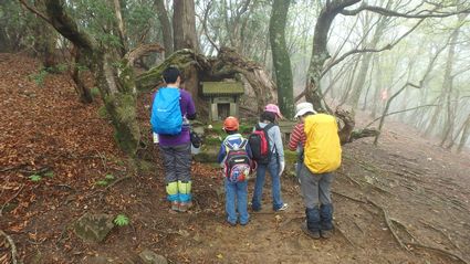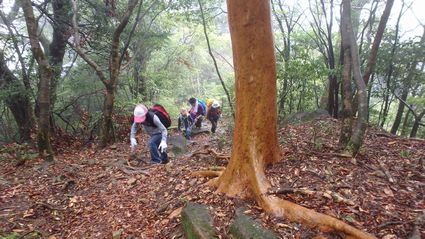 | ▼登山口から最初は階段が続きます | ▼巨木発見! 4人の両手を広げて囲みます | |
