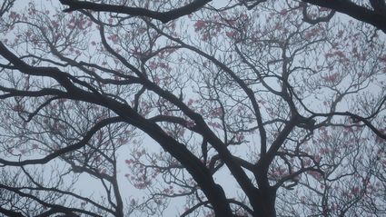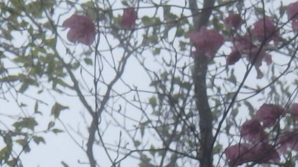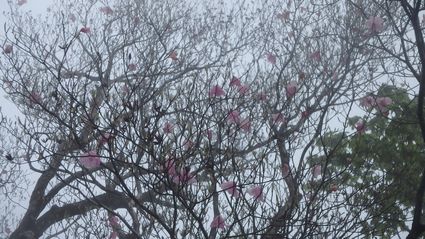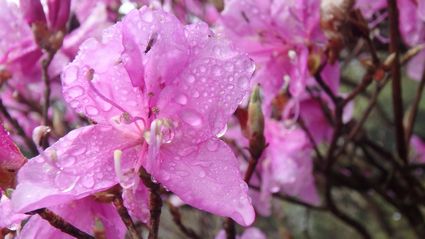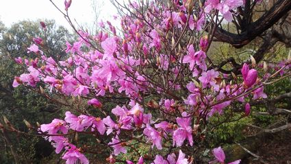 | ▼ピンク色の強いミツバツツジです | ▼先端に花を残す巨木のアケボノツツジ | |