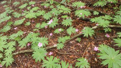 | ▼周回路分岐点にもアケボノツツジがありました。 | ▼左記の花びらがヤブレガサの葉に乗っかっています | |