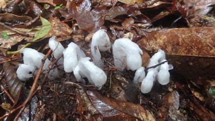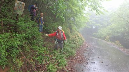 | ▼分岐からもシャクナゲが迎えてくれますがギンリョウソウ発見 | ▼林道へ下山しました。 駐車場へのショートカット道は雨で滑るため林道を下ります |
