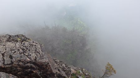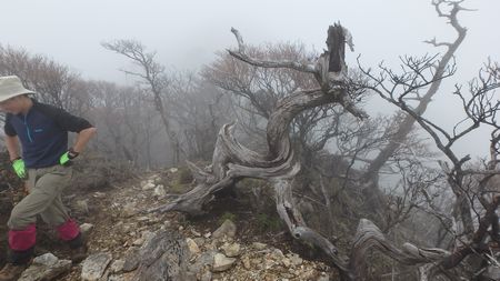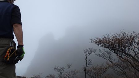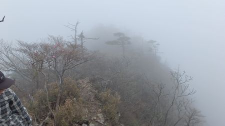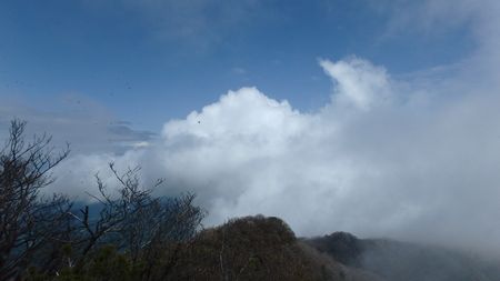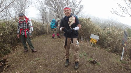| ▼知り合いのSさんにシャッターを押して頂きました(感謝) | ▼ガスの切れ間に一瞬だけ青空が広がります。 | |