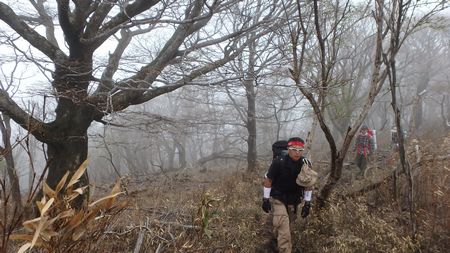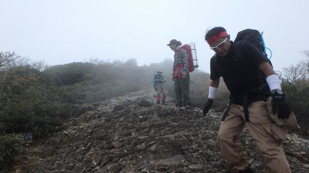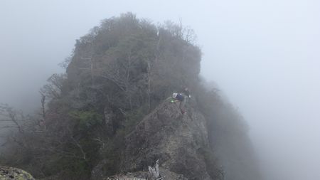 | ▼展望岩からガスにけむる天狗岩を確認後に天狗岩へ向います⇒右画像! | ▼痩せた岩場を通過して天狗の鼻部を目指すメンバー ☆滑落注意!・・・足下は切れ落ちています。 |