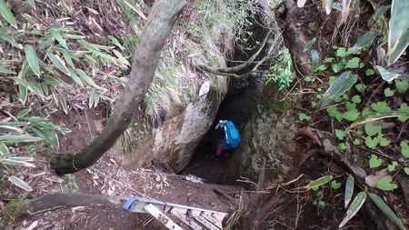| ▼駐車場から5分で小さい沢を渡ります | ▼駐車場から45分で風穴に到着しました。 内部には氷が残り冷風が心地良いです♪ ※最深部に入るにはザイル・ヘッデンが必要! |