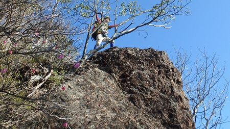 | ▼風穴を過ぎるとアケボノツツジの歓待を受けます♪ | ▼短いですがロープの付けられた岩場を登ります。 | |