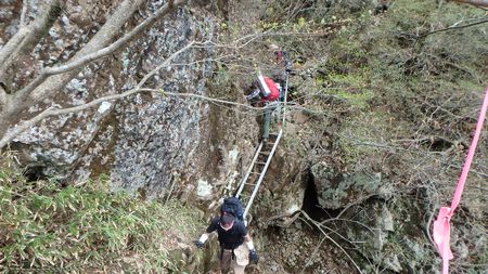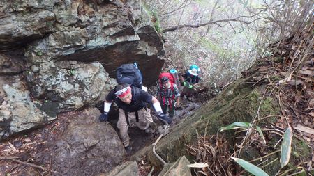 | ▼祖母山山頂直下の岩場&ハシゴ場が縦走路の核心部です。 一人ずつ3点確保で通過しましょう。 |