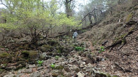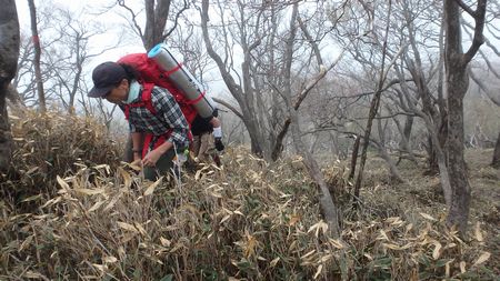 | ▼黒岳からスズタケの急坂を滑りながら下ります。 | ▼スズタケが終わり苔むした沢筋を下ります。 | |