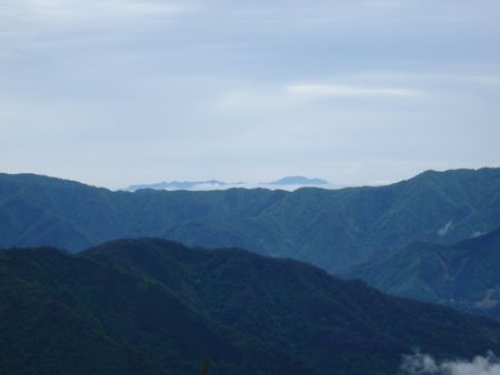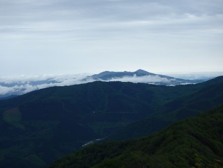 ▼奥の尖がりは烏帽子岳から望む、祖母山です。 | |