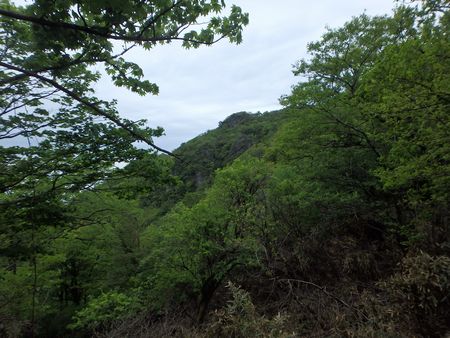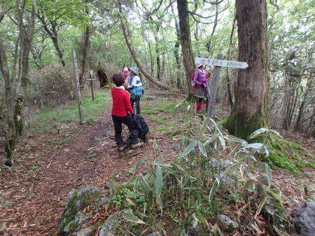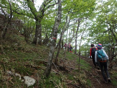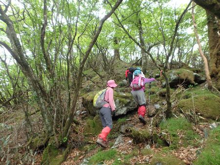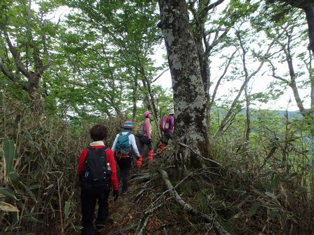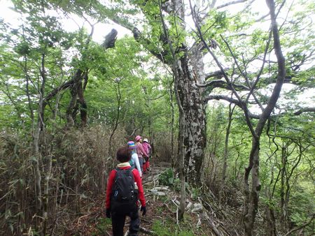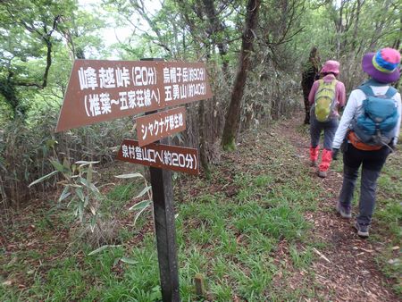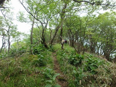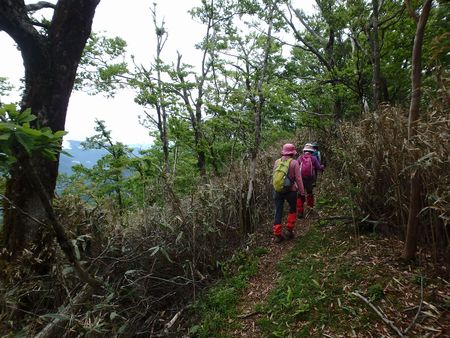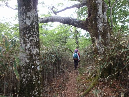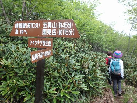| ▼五勇山・国見岳分岐です。 シャクナゲが群生していますが今年は裏年みたいです〜来年に期待! |