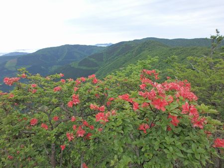 | ▼新緑の芽吹きが癒してくれます。 | ▼ツツジが咲いています・・・奥には市房山が見えます | |